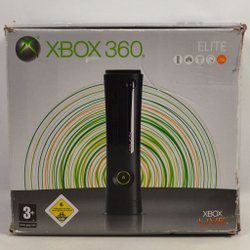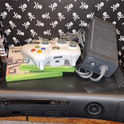 Svart Xbox 360 konsol med strömkabel och fem spel: Grand Theft Auto V, FIFA 09, FIFA 11, FIFA 12 och NHL 07.