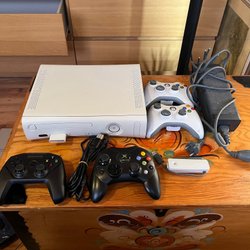 Xbox 360 med tillbehör säljes. Inkluderar en trådlös handkontroll, strömadapter, HDMI-kabel och en Xbox 360-tillbehör.