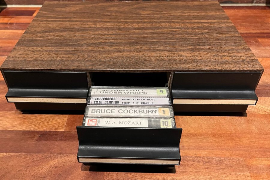 Kassettlåda i träimitation med plats för 36 av dina mest älskade kassettband. Storlek 38/28/10 cm.