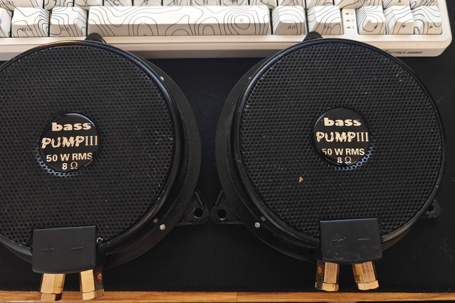 Två Bass Pump III-högtalare med 50 W RMS effekt och 8 Ohms impedans.