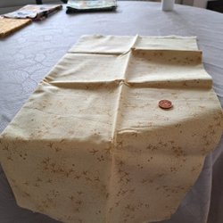 Vikt cirka 65 gram utan emballage. Bilderna visar en varsin halva av tyget. Mått ca 36.5(en cm mindre på ena halvan)x107 cm. Pga av brist på sömnsmån kan du inte få till hela översta bården. På ena halvan av tyget saknas sömnsmån för nedersta bården (se bild 2).