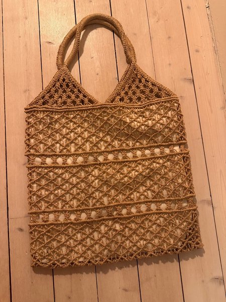 Väska med ett intrikat makramémönster som ger en unik och handgjord känsla. Väskan har en öppen design och flätade handtag som är bekväma att bära över axeln eller i handen. Den är perfekt för att bära lättare föremål och passar bra för en avslappnad stil.