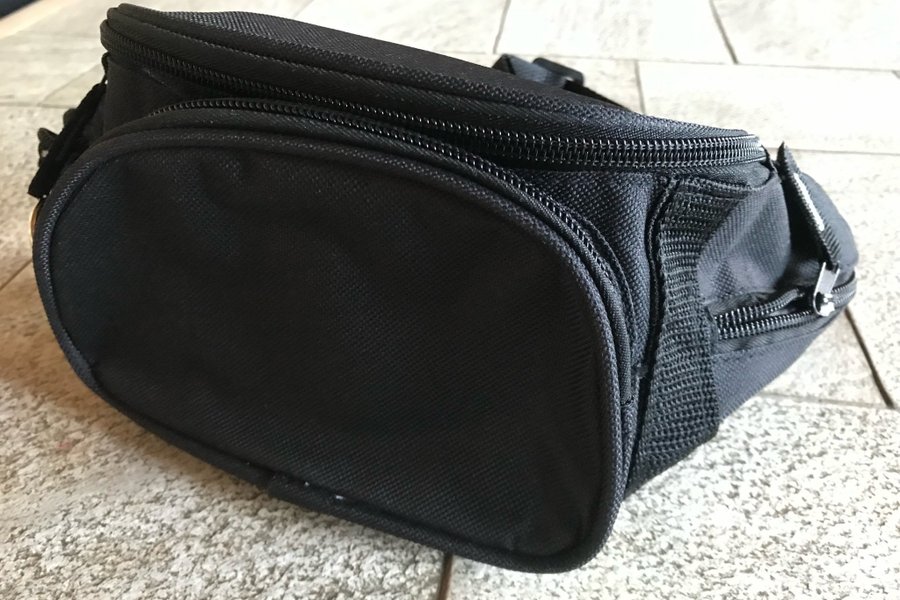 Sort bæltetaske med flere lommer.