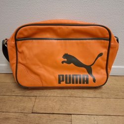 Röd duffelväska med bruna handtag och en brun läderrem med spänne som håller ihop handtagen. Väskan har en dragkedja upptill och är rymlig inuti.