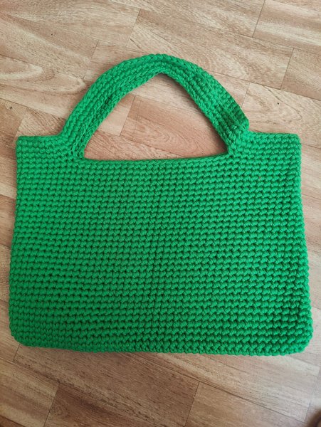 Handväska i grön färg. Väskan är virkad med ett tätt mönster och har två handtag. Den är rektangulär i formen. Mått 40x30 cm.