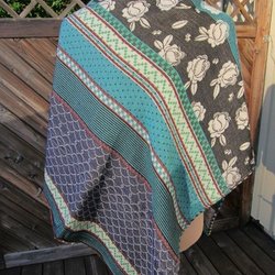 Färgglad/Rosa sjal med fransar. Sjalen har ett blommönster i samma färg som sjalen. Den har även ränder i orange och mörkare rosa med mönster.