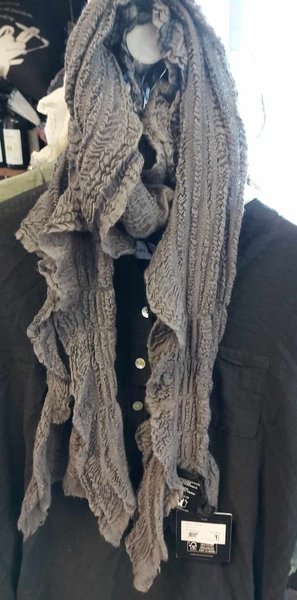 Grå, texturerad halsduk. Den har en unik och intressant design som ger en extra touch till din outfit.