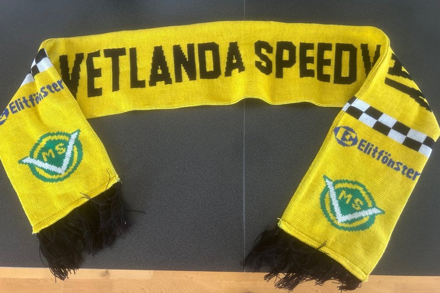 En gul stickad halsduk med texten ”VETLANDA SPEEDWAY'i svart. Halsduken har även logotyper för ”Elitfönster” och ”MS” i grönt och vitt. Den har svarta fransar.