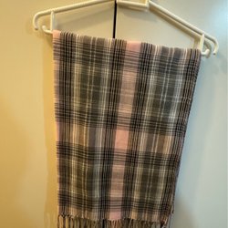En mjuk och fluffig halsduk i en ljusrosa nyans. Halsduken har fransar i ändarna och en rektangulär brun lappdetalj.
