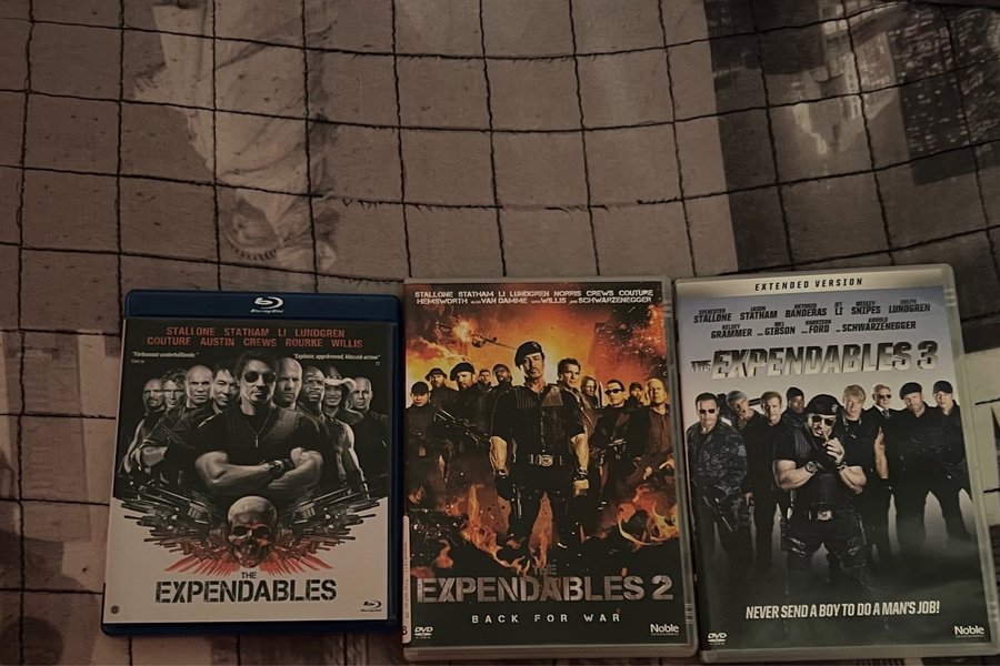 Blu-ray och DVD filmer: The Expendables 1, The Expendables 2 Back for War, The Expendables 3 Extended Version. Svensk text finns