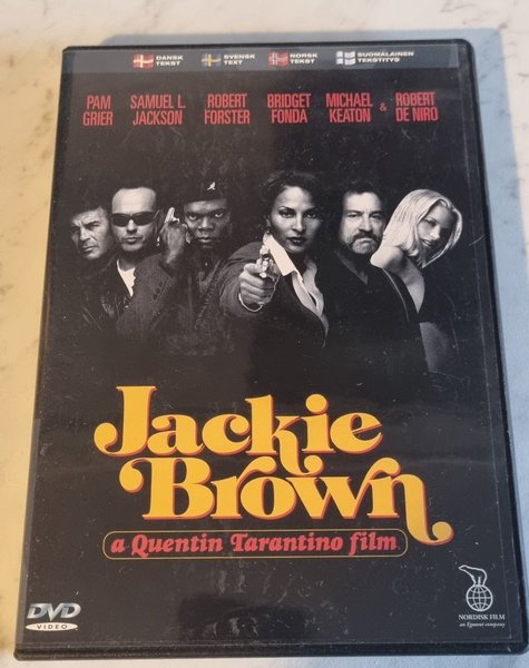 DVD-film med titeln "Jackie Brown" av Quentin Tarantino. Skådespelare inkluderar Pam Grier, Samuel L. Jackson, Robert Forster, Bridget Fonda, Michael Keaton och Robert De Niro. Filmen har textning på danska, svenska, norska och finska.