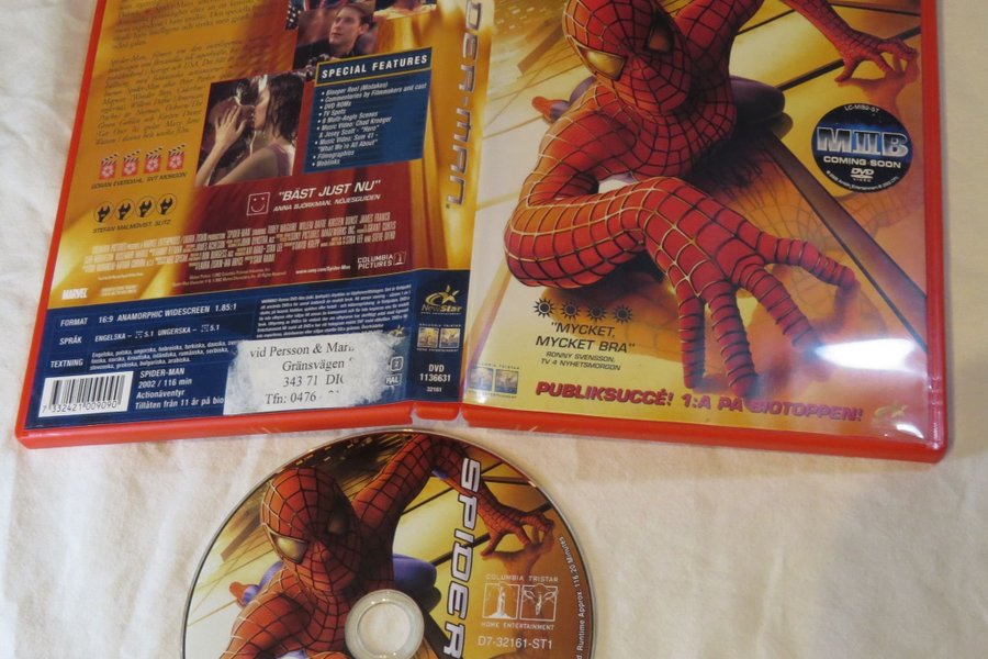 Spider-Man DVD med Tobey Maguire. Filmen är från 2002 och har en speltid på 116 minuter. Den innehåller specialfunktioner som bloopers, kommentarer och musikvideor.
