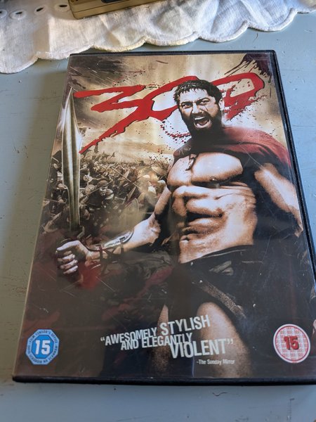 Filmen 300 på DVD. Baserad på serieromanen av Frank Miller. Filmen skildrar slaget vid Thermopylae där kung Leonidas leder 300 spartaner mot den persiska armén.