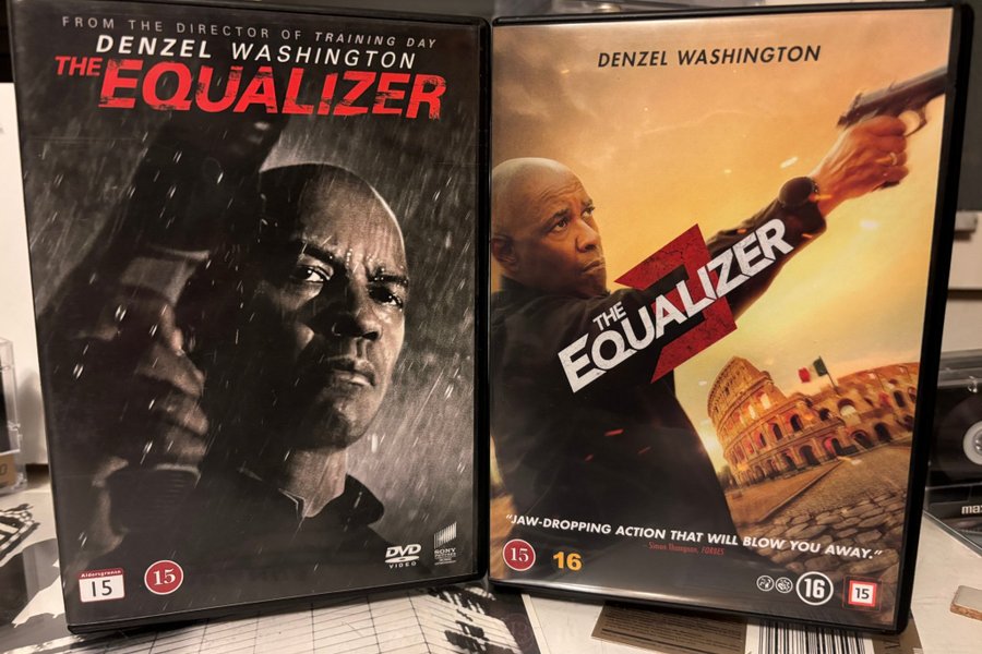 Två DVD-filmer med Denzel Washington i "The Equalizer". Filmerna är från regissören av "Training Day".