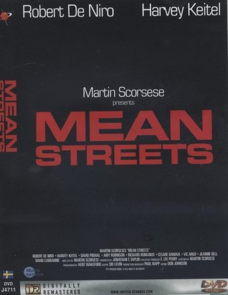 DVD-film "Mean Streets" presenterad av Martin Scorsese, med Robert De Niro och Harvey Keitel i huvudrollerna. Filmen är digitalt remastrad. Skådespelare inkluderar även David Proval, Amy Robinson, Richard Romanus, Cesare Danova, Vic Argo, Jeannie Bell och David Carradine. Regisserad av Martin Scorsese. text: svenska norska danska finska 107 min. (1973)