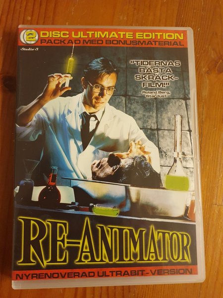 Re-Animator på DVD. Denna utgåva är en 2 Disc Ultimate Edition, packad med bonusmaterial och är en nyrenoverad ultrabit-version. Textning: Svenska, Finska, Norska, Danska
