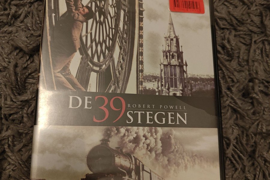 DVD-film "De 39 Stegen" med Robert Powell. Filmen beskrivs som "Den bästa nyinspelning som gjorts av en Hitchcockfilm".