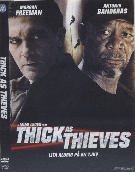 DVD-film "Thick as Thieves" med Morgan Freeman och Antonio Banderas. Regisserad av Mimi Leder. Texten "Lita aldrig på en tjuv" finns på omslaget. 99 min (2009) text: svenska norska danska finska