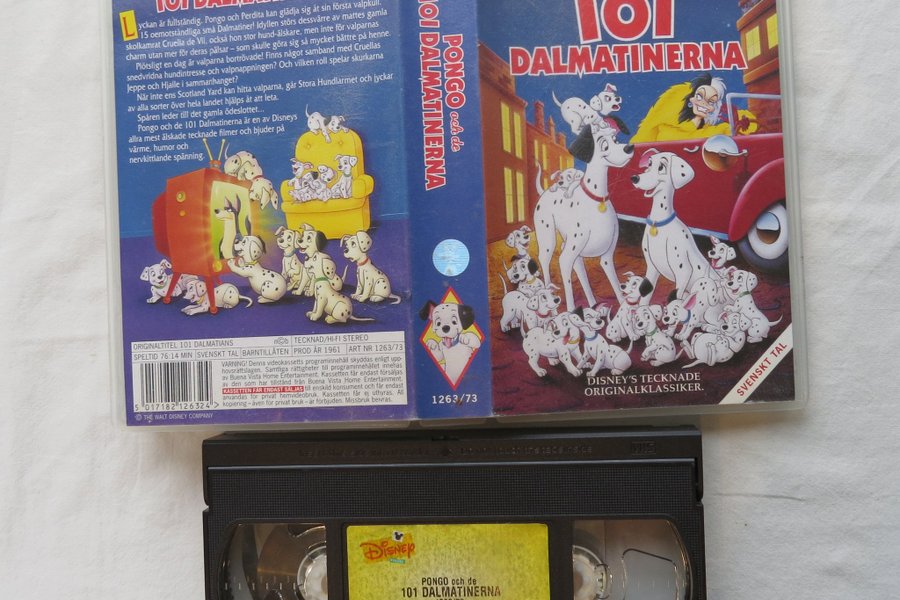 VHS-kassett med "Pongo och de 101 Dalmatinerna". Originaltitel: 101 Dalmatians. Speltid: 76:14 minuter. Svenskt tal. Barntillåten. Produktionsår: 1961. Artikelnummer: 1263/73. Disney Klassiker.