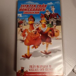 VHS-kassett med filmen Flykten Från Hönsgården. Svenskt tal och svensk text. Från skaparna av Wallace och Gromit.