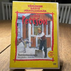 DVD med Gubben Pettson i Tomtemaskinen. En julkalender från 1993 av Sven Nordqvist. Filmen handlar om Pettson och Findus julbestyr.