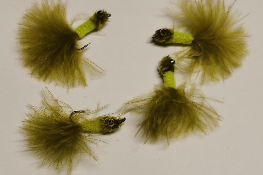 Fyra stycken flugor för flugfiske.
