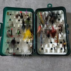 Set med flugor i en praktisk förvaringslåda. Innehåller olika färger och mönster, lämpliga för fiske. Lådan är lätt att transportera och hålla ordning på flugorna.