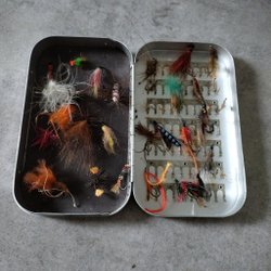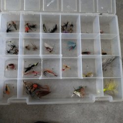 Set med flugor för fiske, förvarade i en plastlåda. Innehåller olika färger och mönster.