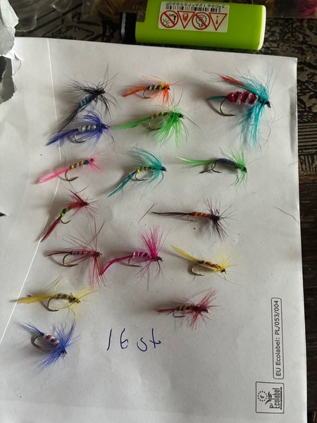 Ett urval av 16 färgglada fiskeflugor. Passar för olika fiskeformer. Se bilder för detaljer.