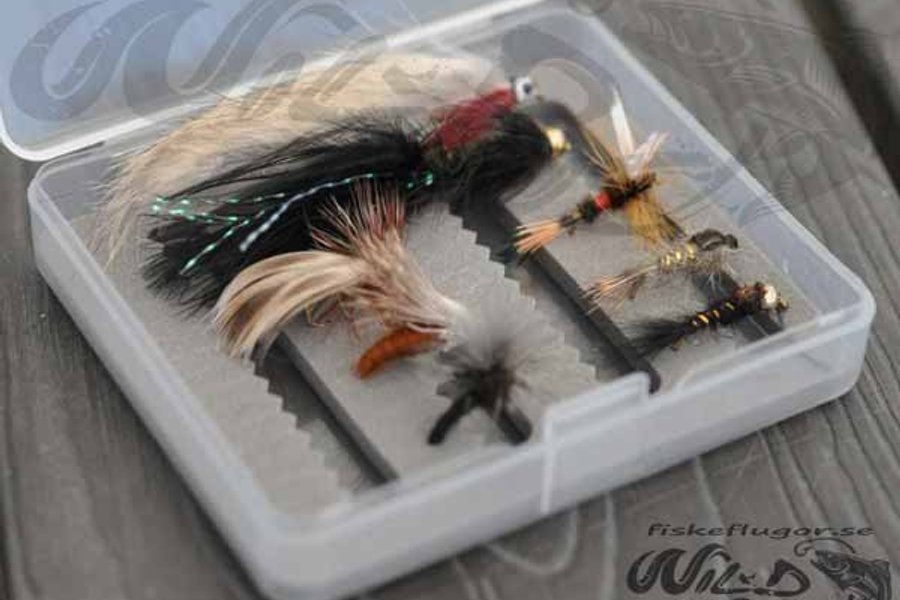 8 stycken mixade fiskeflugor med smidig liten flugask.