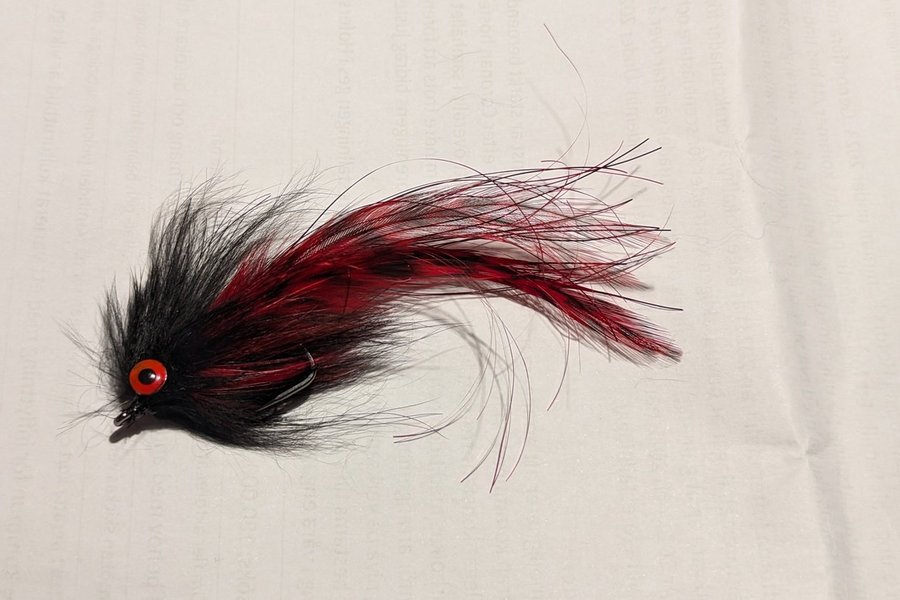En gäddfluga med krok. Den är har svart och rött samt en ögonförsedd skalle.