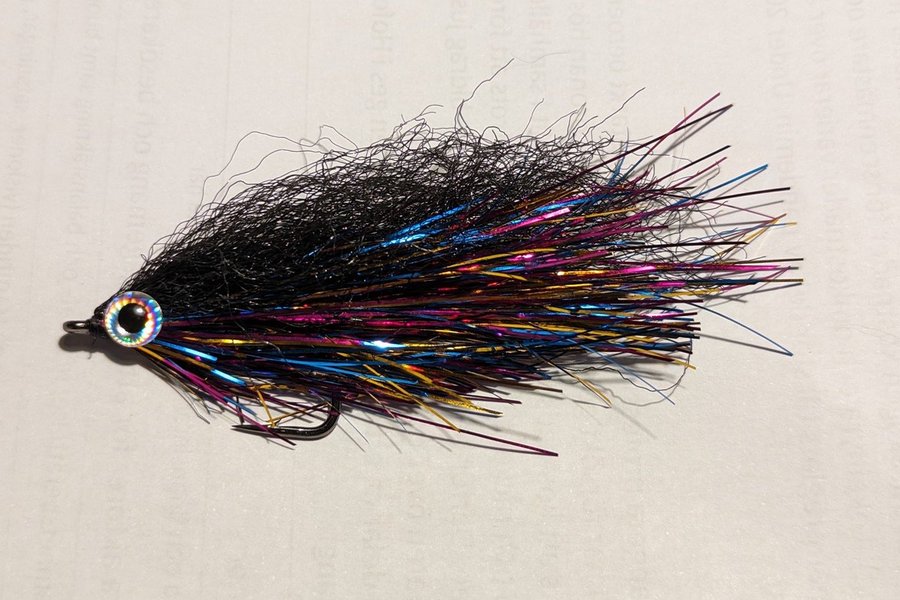 En gäddfluga med krok. Den är har blått, gult och rött flashmaterial samt en ögonförsedd skalle. Även ett krulligt svart ryggmaterial.
