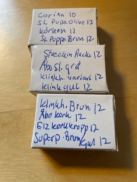 Corixa stl 10, Klinkhamer brun stl 12, Körken stl 12, Superpuppa stl 12
