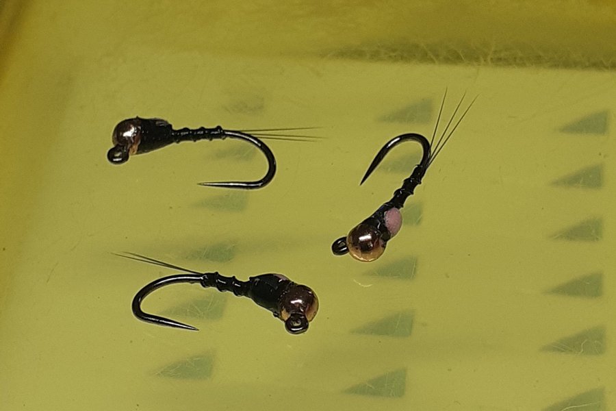 Euronymf utvecklad av Gilbert Rowley, USA. Lickety Split Jig Nymph med copper (2,5 mm slotted tungsten), svart bindtråd, svart wire, pink vingsäck och svart micro fibetts. Bunden på Hends jigkrok 120 stl 16.