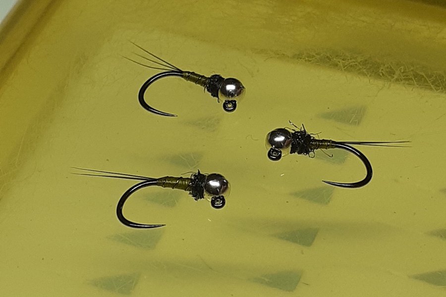Tävlingsfluga utvecklad av Lance Egan, USA. Thread Frenchie med silver (2,5 mm slotted tungsten), light olive bindtråd, copper wire och svart micro fibetts. Spectra 45,5 peacock hotspot. Bunden på Hanak jigkrok 450 stl 18.