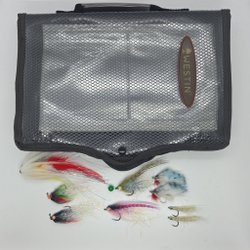 Lot med flera fiskedrag/flugor i olika färger, med krokar och fjäder-/pälsdetaljer. Några har glitter- eller skuminslag och andra är klassiska streamers med markerad kropp och ögla.