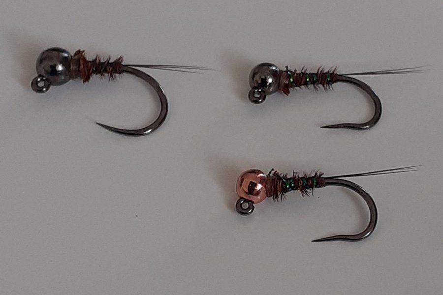 Pheasant tail-nymfer med black nickel (2,5 och 3,0 mm slotted tungsten) och copper (2,5 mm slotted tungsten), naturell fasan, krystal flash green (Hends 220) och svart micro fibetts. Bunden på Hanak 470 stl 16 och Hanak 450 stl 16.