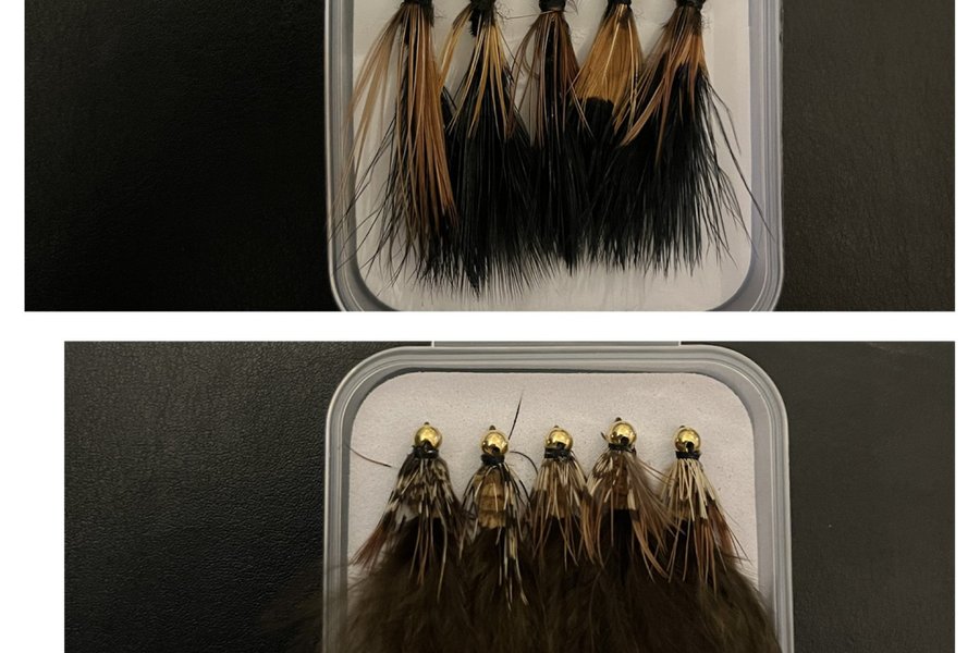 Set med 10 fiskeflugor med guldhuvud och volymrika maraboufjädrar i svart och brun. Krokar synliga upptill.
