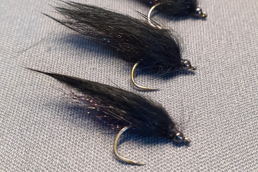 Zonker med vinge av svart kaninhår och undervinge av Ice dub UV black. Black nickel 2,0 mm (round tungsten). Krok: Tiemco 2499 stl 10.