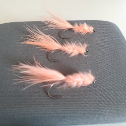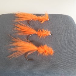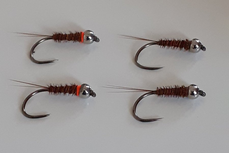 Pheasant tail-nymfer med silver (2,4 mm round tungsten), light olive fasan, brown wire och brown micro fibetts. Två med fluo orange hotspot och två neutrala utan hotspot. Bunden på Hends 454 stl 14.