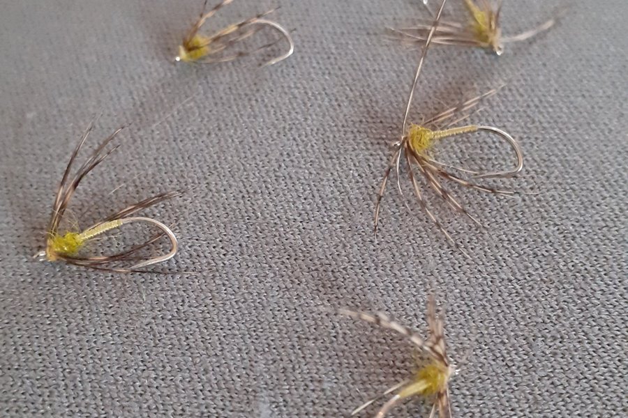 North country spider fly - Partridge & Olive. Originalmönster med fjäder från rapphöna (partridge) och Pearsall's Gossamer silk i färgen Light Olive. Bunden på kvalitetskrok: Alec Jackson's North-Country Trout Hook storlek 15.
