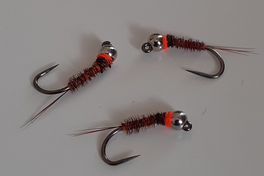 Pheasant tail-nymfer med silver (2,5 mm round tungsten), naturell fasan, brown wire och brown micro fibetts. Fluo orange hotspot. Bunden på Hends jigkrok 120 stl 14.