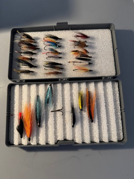 En samling laxflugor i olika färger och mönster. Alla i en praktisk ask. Osäkert om någon sett vattnet. Se vidare bild.