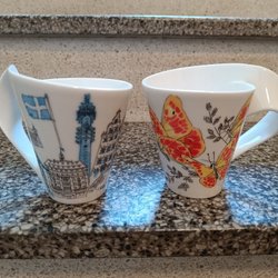 Två stycken koppar med tillhörande fat från Allmoge. Dekorativa blommor och blad.