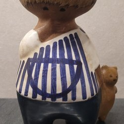 En charmig keramikfigur av Lisa Larson, föreställande Malin med en nalle. Figuren är märkt med ”Design Lisa Larson” och ”Sweden Malin” undertill. Perfekt för samlaren eller som en dekorativ detalj i hemmet.