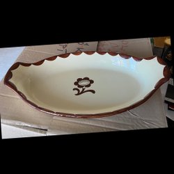 En oval ugnsform från Gustavsberg, Pyro-serien. Formen är vit med en brun blomdekor i mitten och en brun vågig kant.