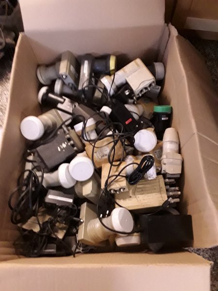 En liten låda med div.begagnade Universal LNB.ca 30 st Singel till octo och sat-cr.