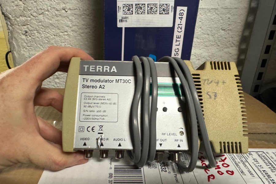 TERRA TV modulator MT30C Stereo A2 med utgångskanaler E2-69 (B/G stereo A2). Utnivå på 92 dBµV/75 O och S/N-förhållande på 255 dB. Strömförbrukning ~220V/50Hz/7VA. Har anslutningar för VIDEO, AUDIO R, AUDIO L, RF OUT och RF IN.