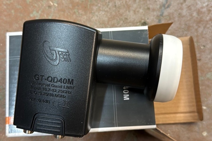 GT-QD40M Universal Quad LNB för satellitmottagning. Ingångsfrekvens: 10.7-12.75GHz. L.O. frekvens: 9.75/10.6GHz. Brusfaktor (N.F.): 0.1dB.