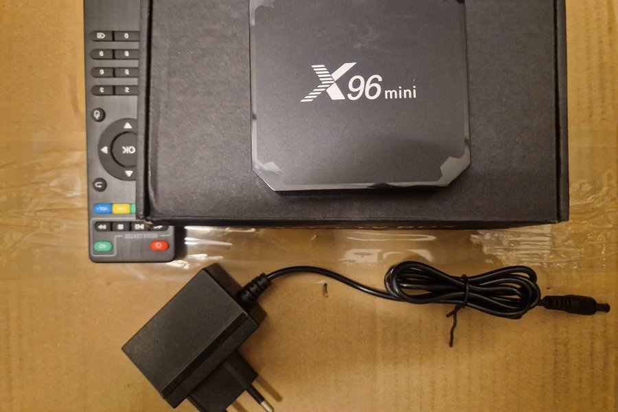X96 mini Android TV Box med fjärrkontroll och strömadapter.